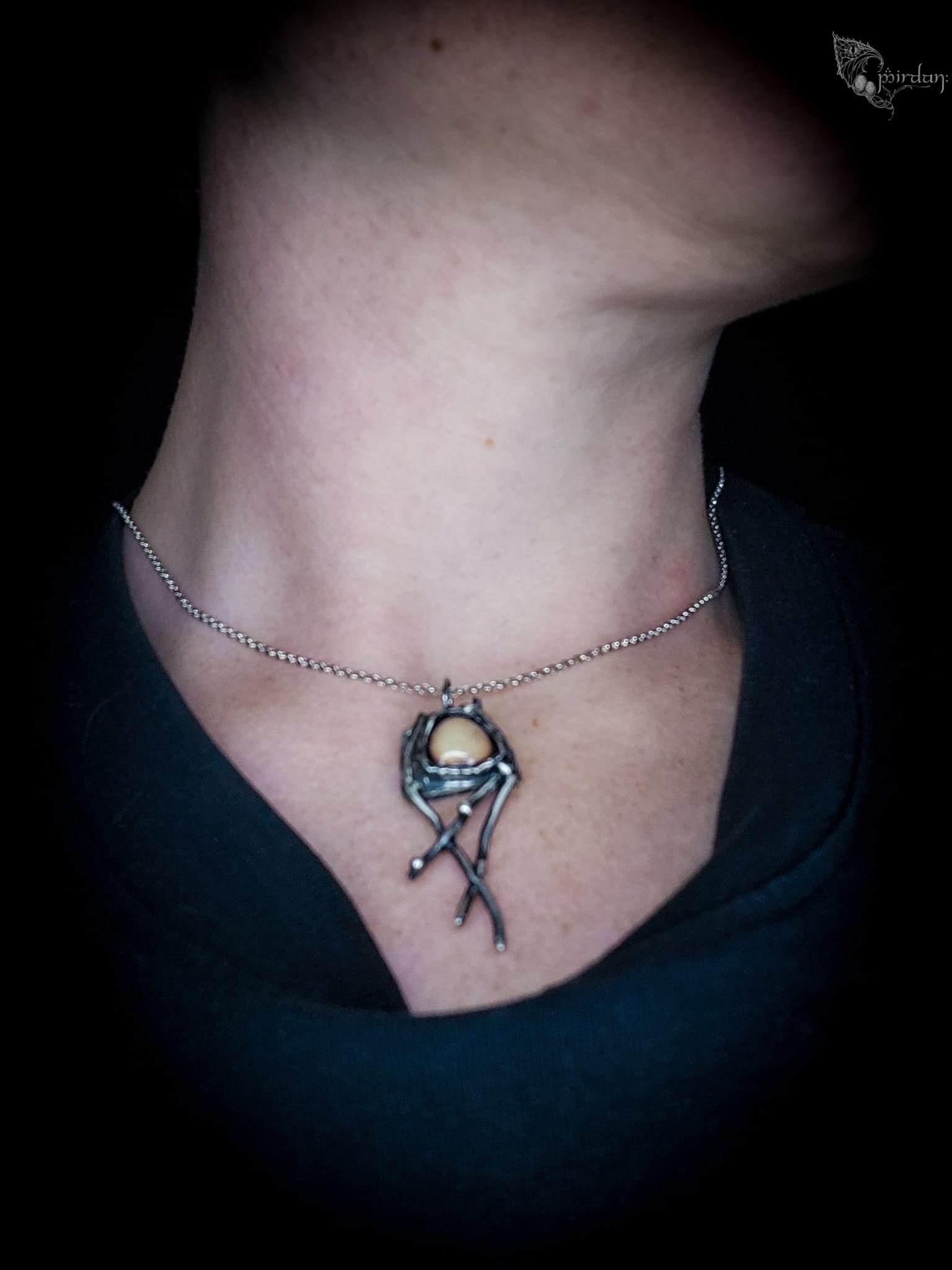 Een betoverend juweel met een geëmailleerd hart, dat zich vertakt als betoverde wortels.